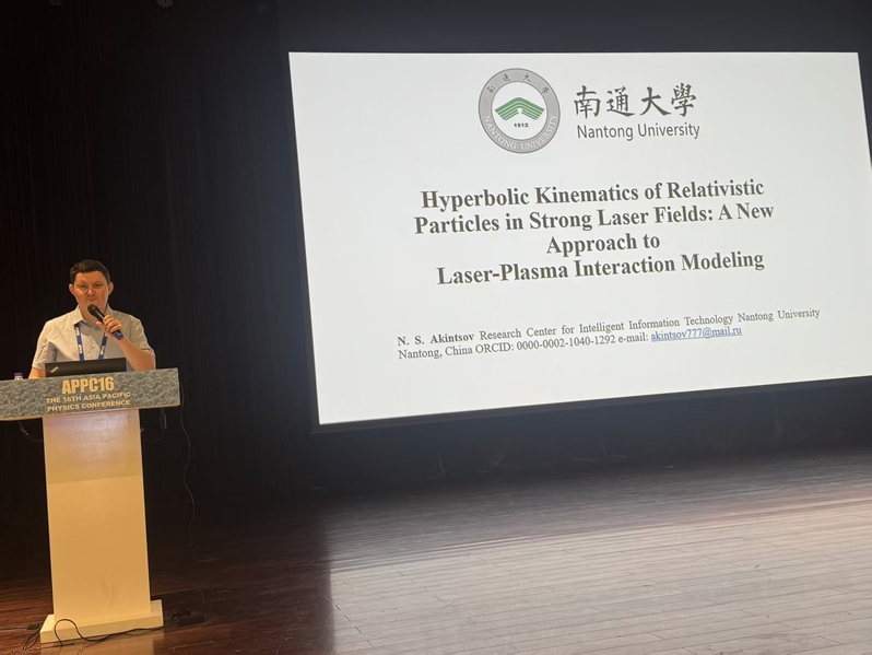 10月19日-24日,第十六届亚太物理会议在海口举行,我中心Nikolai Akintsov博士受邀参会并发表了题为《Hyperbolic Kinematics of Relativistic Particles in Strong Laser Fields: A New Approach to Laser-Plasma Interaction Modeling》的学术报告。