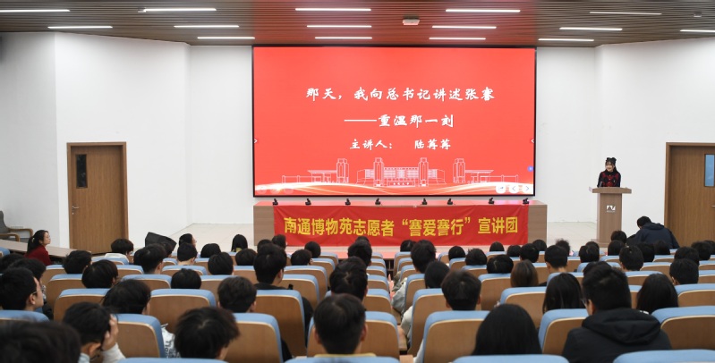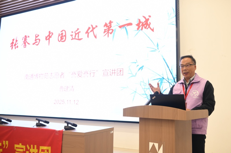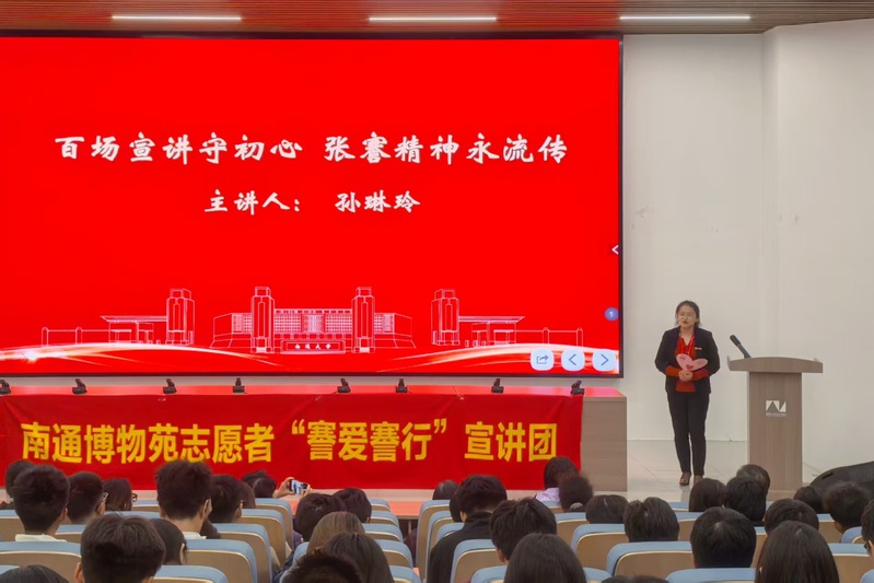 南通市优秀志愿者、南通博物苑十佳志愿者曹建清以《张謇与中国近代第一城》为题,生动讲述了张謇先生在兴办实业、教育与社会公益方面的卓越贡献,号召广大师生将爱国之情、报国之志融入学习科研与奋斗实践中。