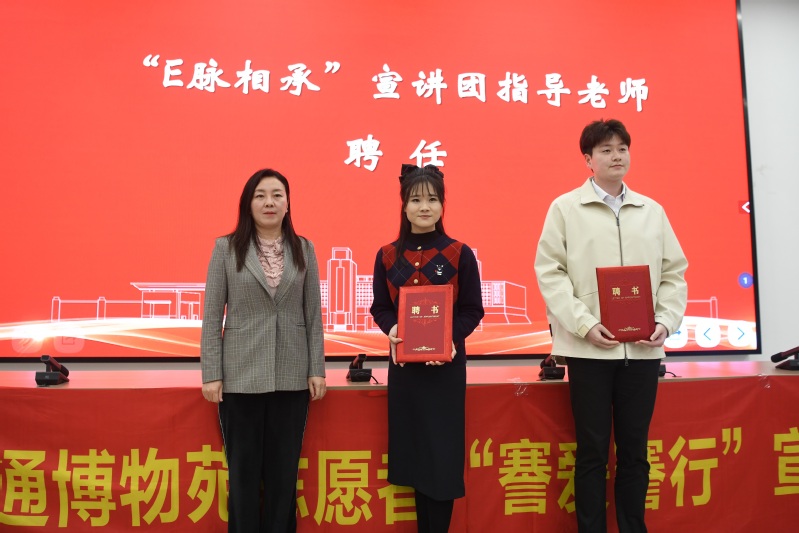 活动现场,举行了信息科学技术学院“E脉相承”校史宣讲团指导老师聘任仪式,校党委宣传部副部长刘艳为指导老师颁发聘书。