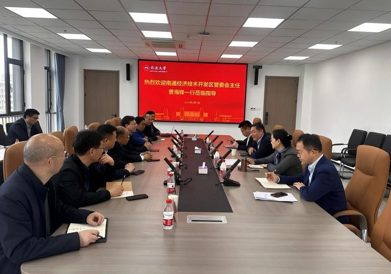 4月7日下午,南通经济技术开发区党工委副书记、管委会主任曹海锋一行来校调研交流。校党委书记杨宇民出席交流会,校党委常委、副校长施佺主持会议。